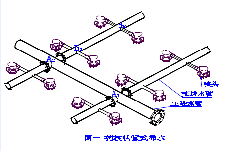 逆流冷卻塔循環(huán)水系統(tǒng)的布水方式采用管式布水,呈樹枝狀,循環(huán)水先進入主管,然后進入支管,再進入噴頭,主管、支管、噴頭相互垂直,如圖一。根據(jù)流體狀態(tài)方程:壓力(P×流速(V)=常數(shù)(K),循環(huán)水從主管流經(jīng)A1點、A2點后,到達主管末端,由于冷卻塔布水需要主管末端是封閉的,因此流速(V)急劇下降,壓力(P)急劇上升,所以A2處比A1處水壓頭大,同理B2處比B1處水壓頭大,綜上分析各布水噴頭處的水壓頭不相