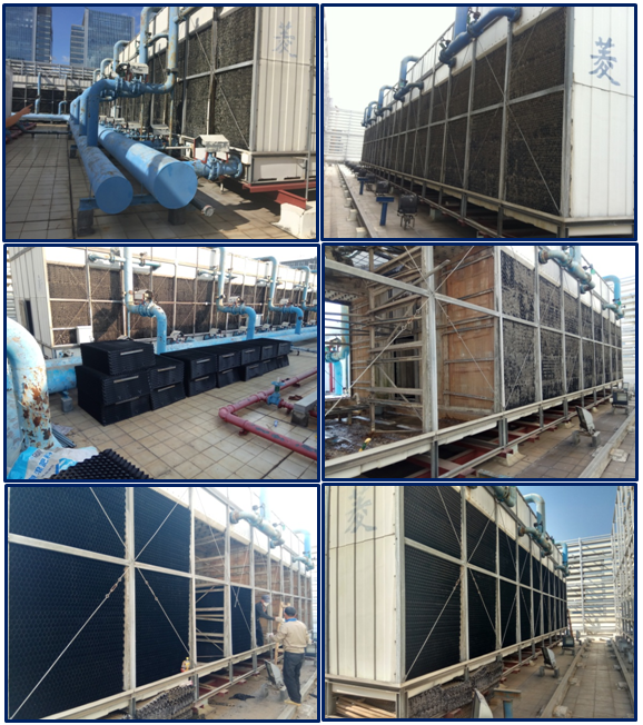 TCL總部大樓采購(gòu)國(guó)內(nèi)知名品牌,冷卻塔總冷量為6000冷噸,原生產(chǎn)廠家已經(jīng)停止生產(chǎn)該款尺寸冷卻塔填料,管道多個(gè)部位均出現(xiàn)破裂漏水,我司排除專(zhuān)業(yè)技術(shù)團(tuán)隊(duì),在不停機(jī)狀況下完成整個(gè)升級(jí)改造,效果于新設(shè)備無(wú)異。