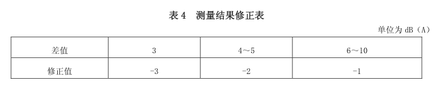 5.7.2 噪聲測(cè)量值與背景噪聲值相差在 3dB (A) ~10dB (A) 之間時(shí),噪聲測(cè)量值與背景噪聲值的差值取整后,按表 4 進(jìn)行修正。